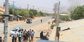 Residents are pictured on the streets of Mandera town as smoke rises from explosions in the neighbouring Bula Hawa town of Somalia, amid fighting between Jubbaland and FGS forces, on March 2, 2020. PHOTO | MANASE OTSIALO | NATION MEDIA GROUP