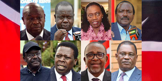 Top row: Rigathi Gachagua, Fred Matiang'i, Martha Karua and Kalonzo Musyoka. Bottom row: Mukhisa Kituyi, Eugene Wamalwa, Mithika Linturi and Justin Muturi.
