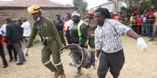 Parts of the plane’s wreckage being carried away from the scene of the crash on Thursday evening. A Cessna plane belonging to Amref Flying Doctors crashed in Mwihoko, killing six people.
