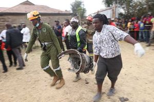 Emergency personnel work at the scene where a Cessna plane operated by Amref Flying Doctors crashed into buildings in the Githurai suburb of northeastern Nairobi, Kenya, August 7, 2025.