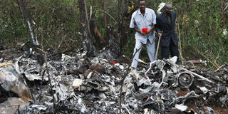 The scene of the police helicopter crash in Kibiku, Ngong forest on June 10, 2012. The Eurocopter was carrying Kenya's Internal Security minister George Saitoti, his deputy Joshua Orwa Ojode along with two pilots and two bodyguards who all died in the crash.