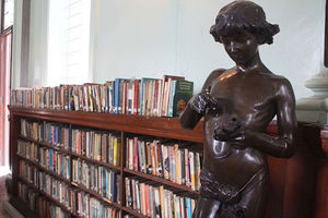 The sculpture of a woman near a bookshelf at the McMillan Memorial Library in Nairobi on July 17, 2019.