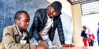 James Chege (left) a polling clerk at James Gichuru Primary School in Dandora confirms the details of Stephen Maina before he casts his vote during the United Democratic Alliance polls on April 26, 2024.