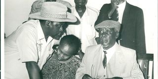 Lang’ata MP Raila Odinga (left), confers with his father, Ford-K chairman Jaramogi Oginga Odinga (right) during campaigns for the Kisauni by-election in Mombasa on December 18, 1993.