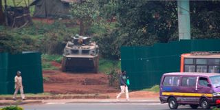 Kenya Defence Forces officers stand guard at the entrance of 20 acres of prime land that has been disputed between Uchumi and Kenya Defence Forces in Roysambu, Kasarani, in 2019.