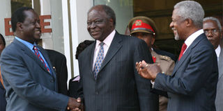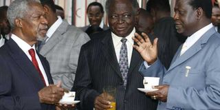 From left: Former UN Secretary-General Koffi Annan, President Mwai Kibaki and Prime Minister Raila Odinga. FILE PHOTO | NATION MEDIA GROUP.