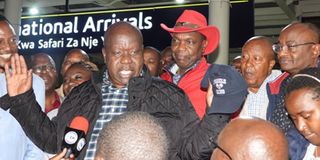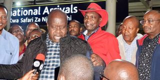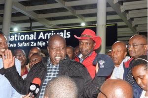 Jubilee Secretary-General Jeremiah Kioni (in red) and other leaders and supporters welcome former Interior CS Fred Matiang'i (centre) on April 18, 2025 at the Jomo Kenyatta International Airport.